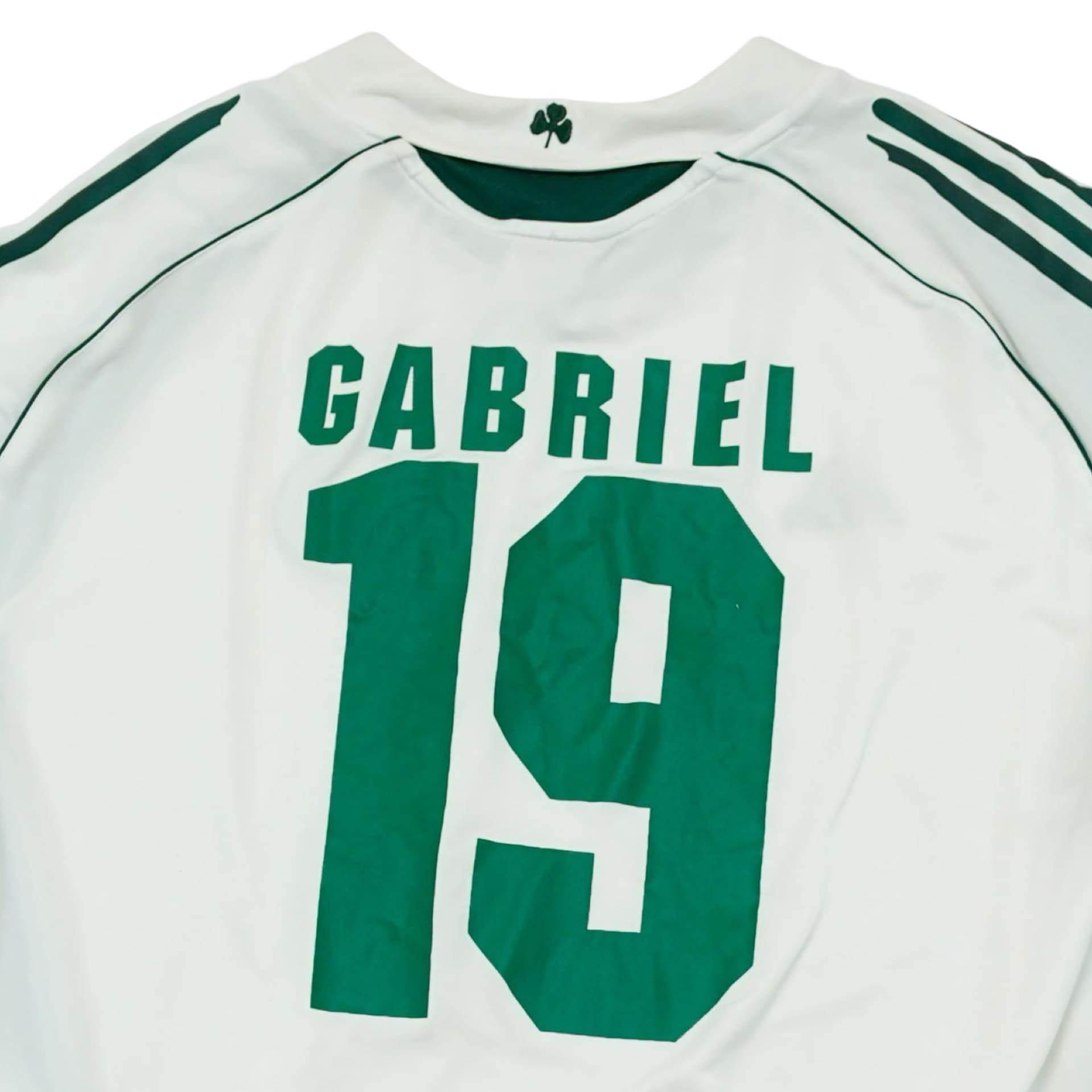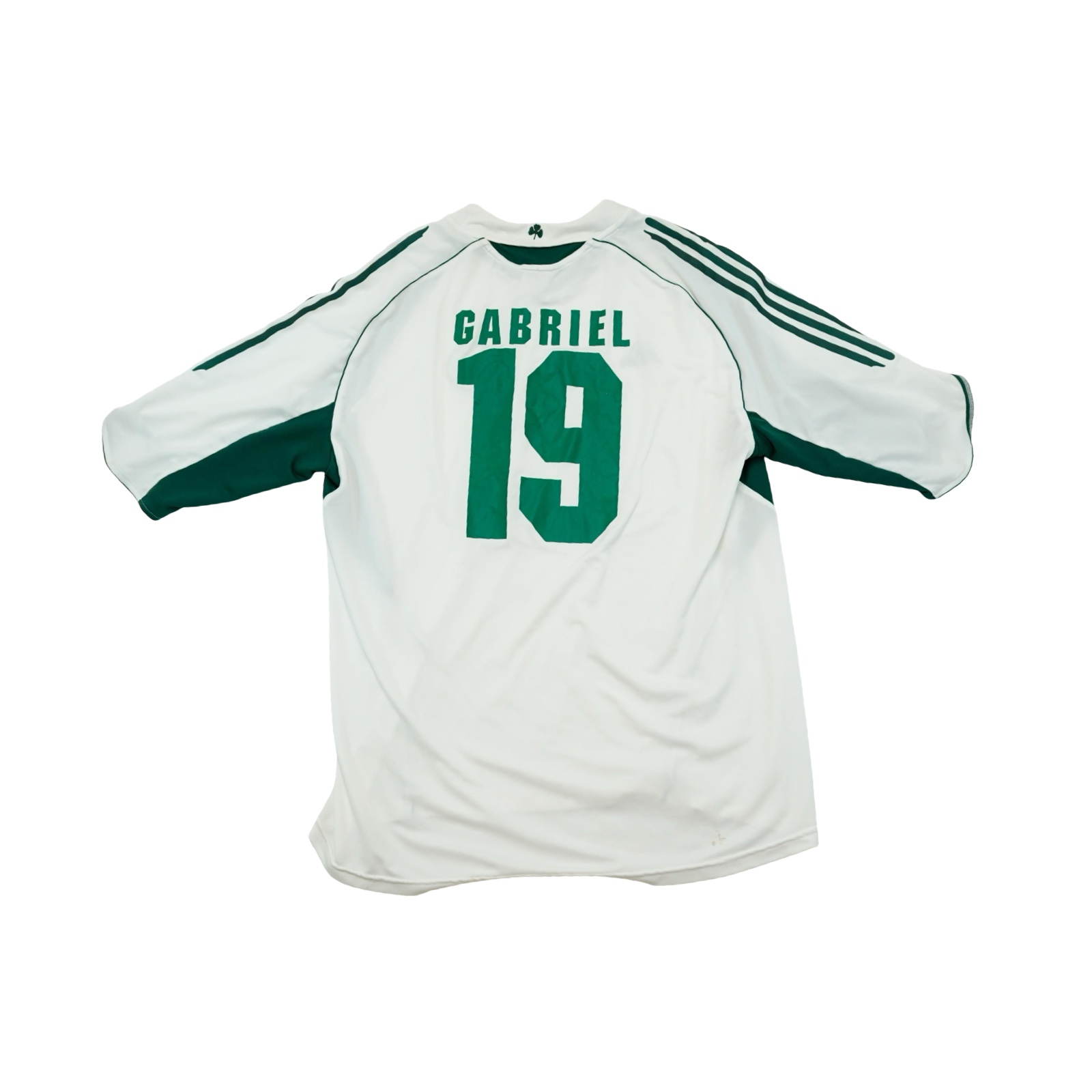 Fotbalový bílý dres značky Adidas s krátkým rukávem a motivem řeckého fotbalového týmu Panathinaikos Athény s hráčem Gabriel.