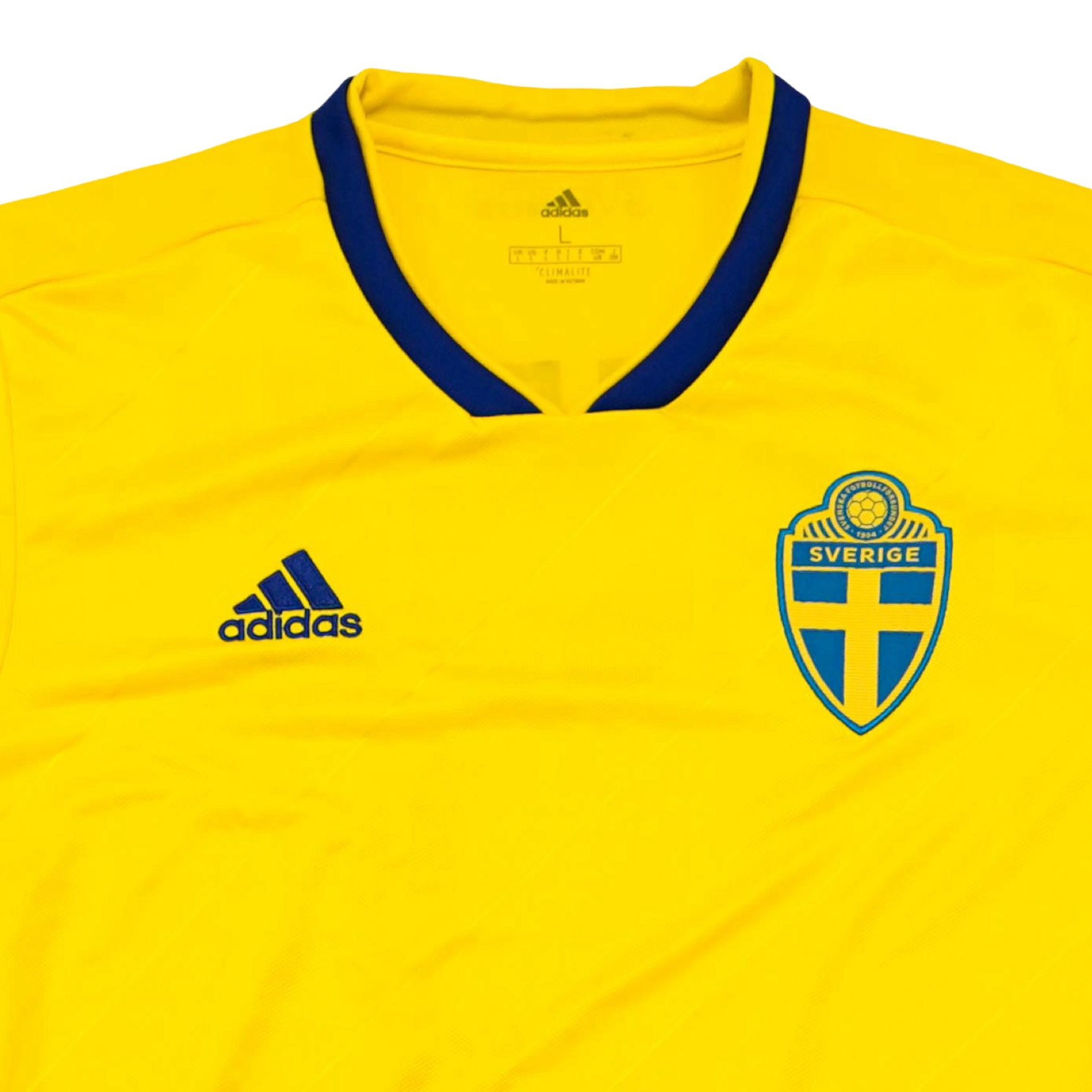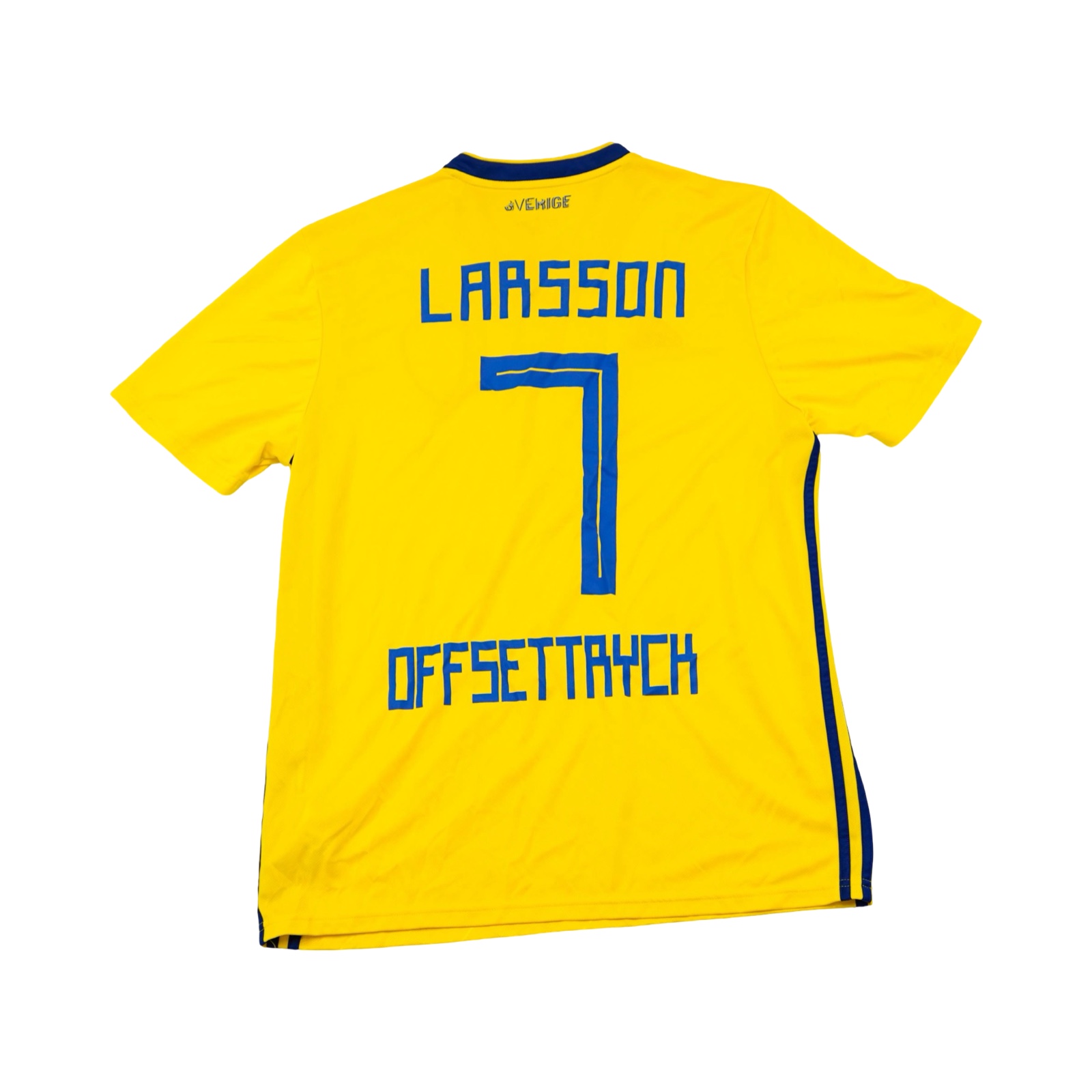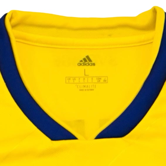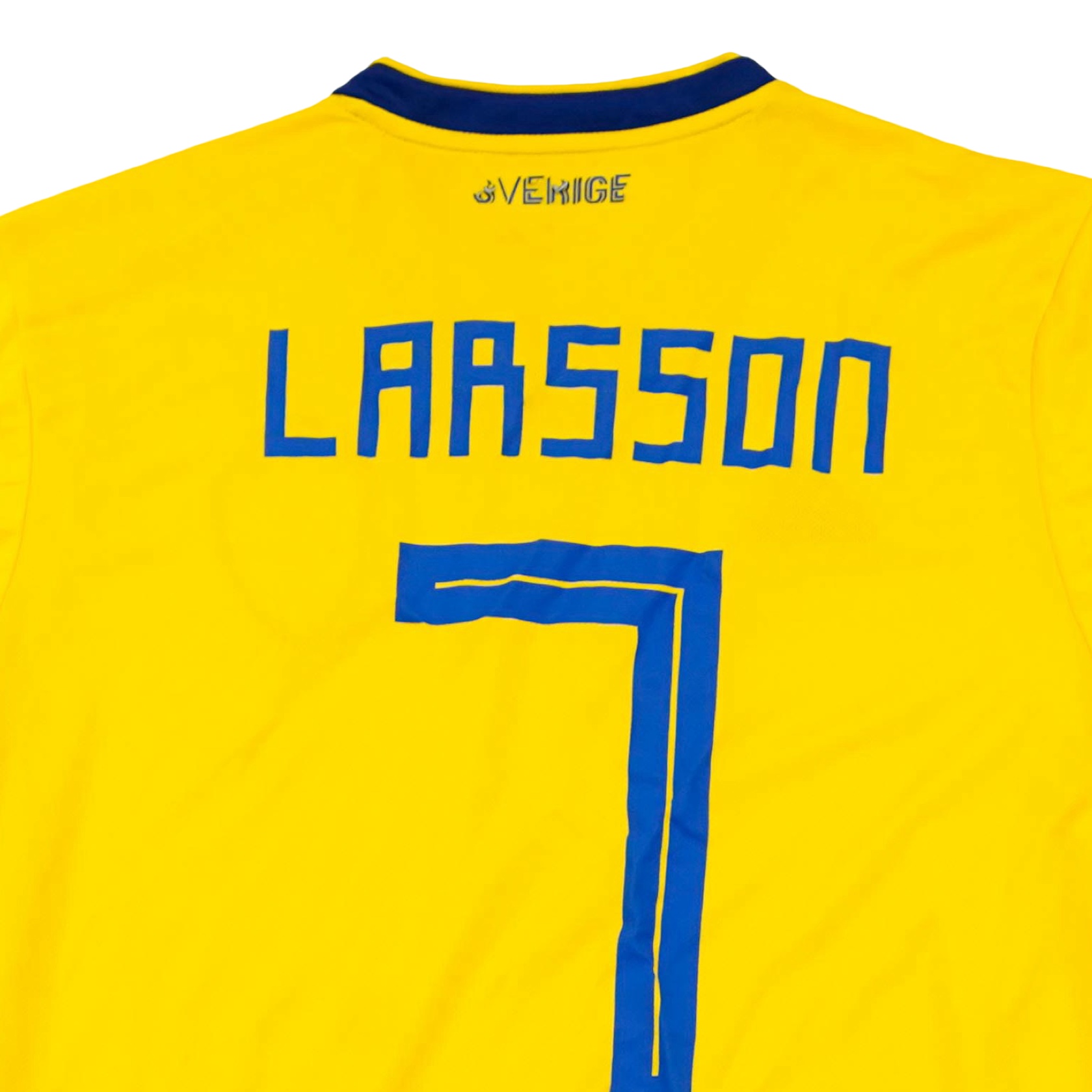 Pánský žlutý fotbalový dres značky Adidas s krátkým rukávem a motivem švédské fotbalové reprezentace s hráčem Larsson.