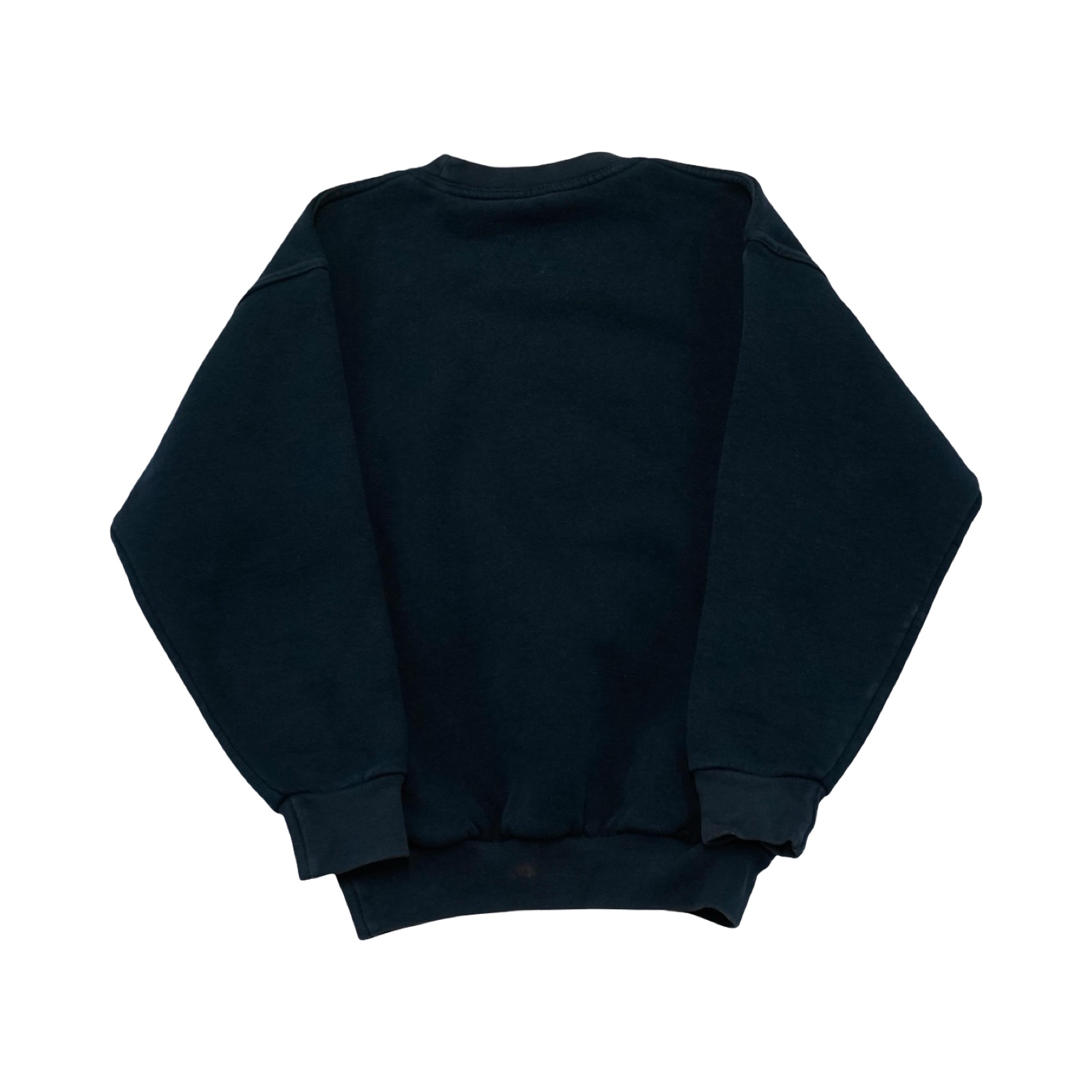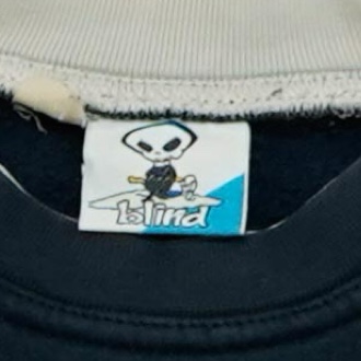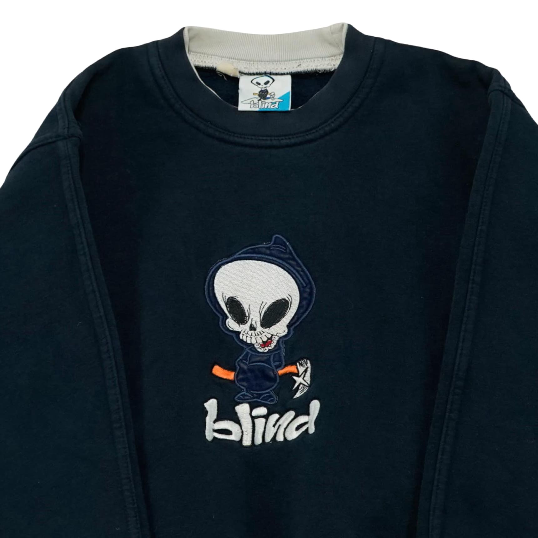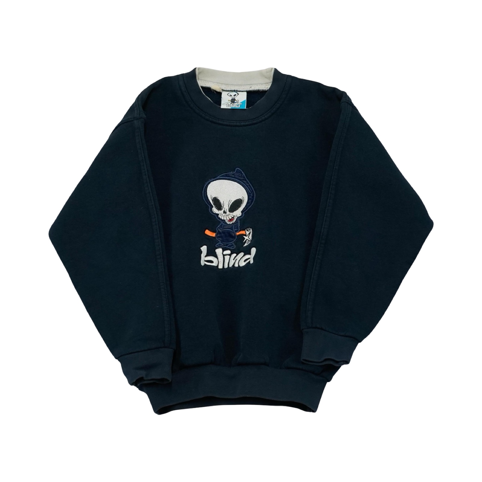 Dětský tmavě modrý vintage crewneck značky Blind s nášivkou na přední straně.