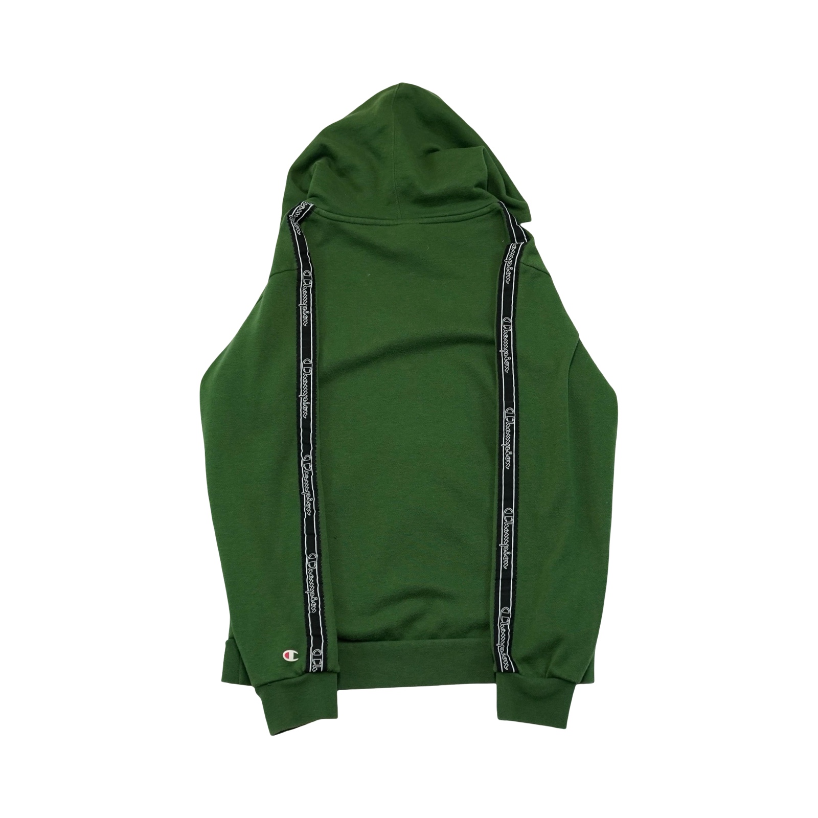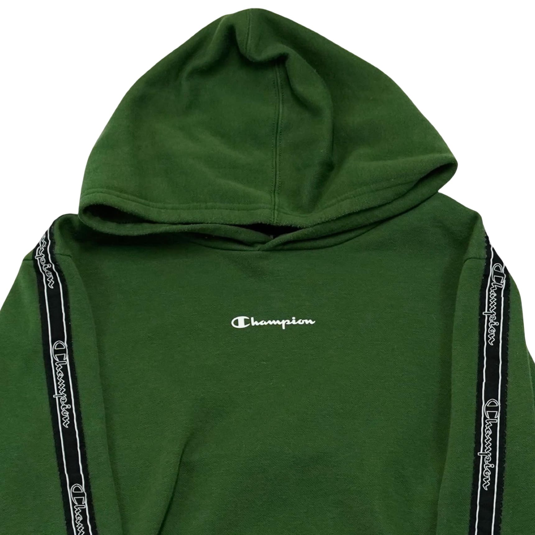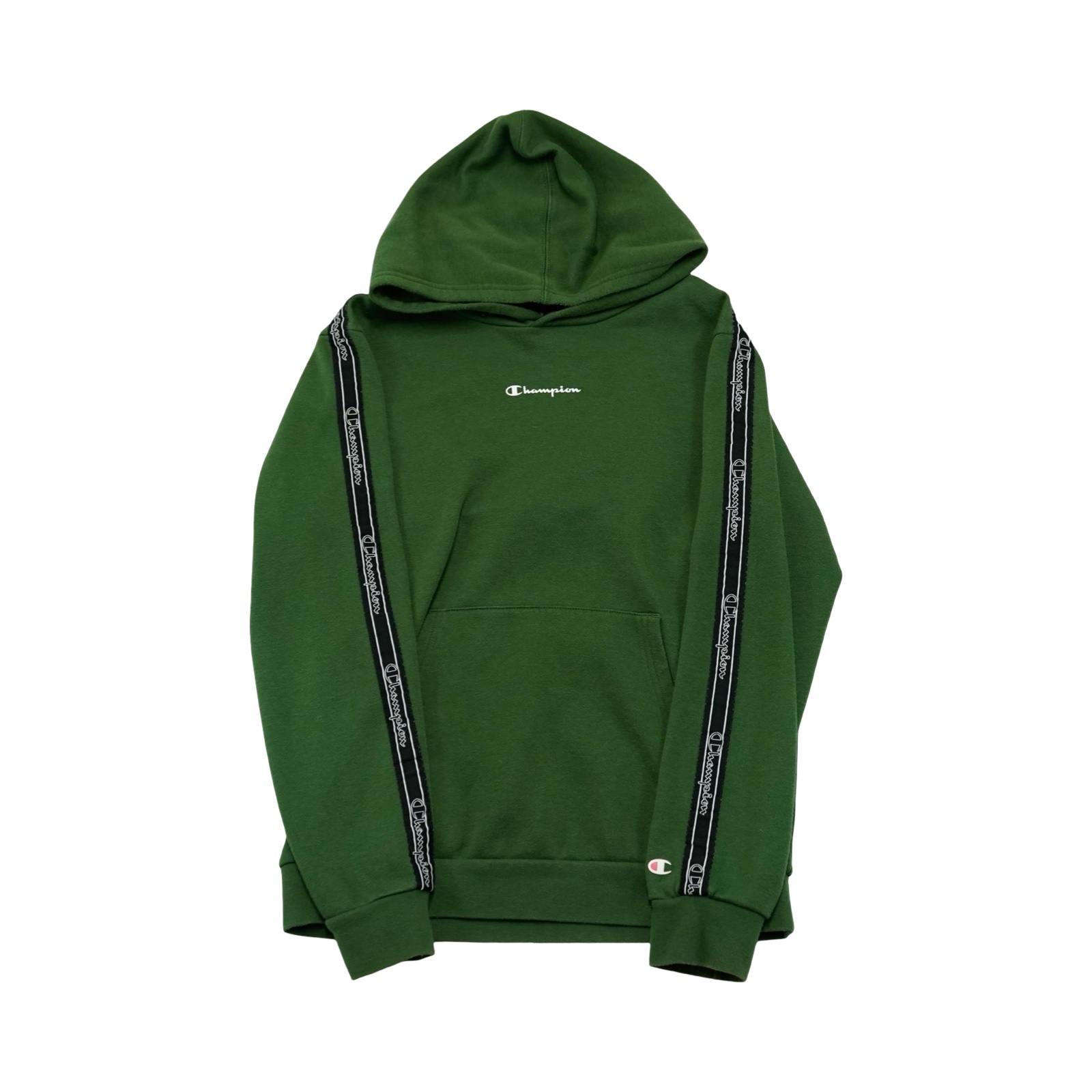 Dětská tmavě zelená mikina s kapucí značky Champion s nášivkou na rukávu.