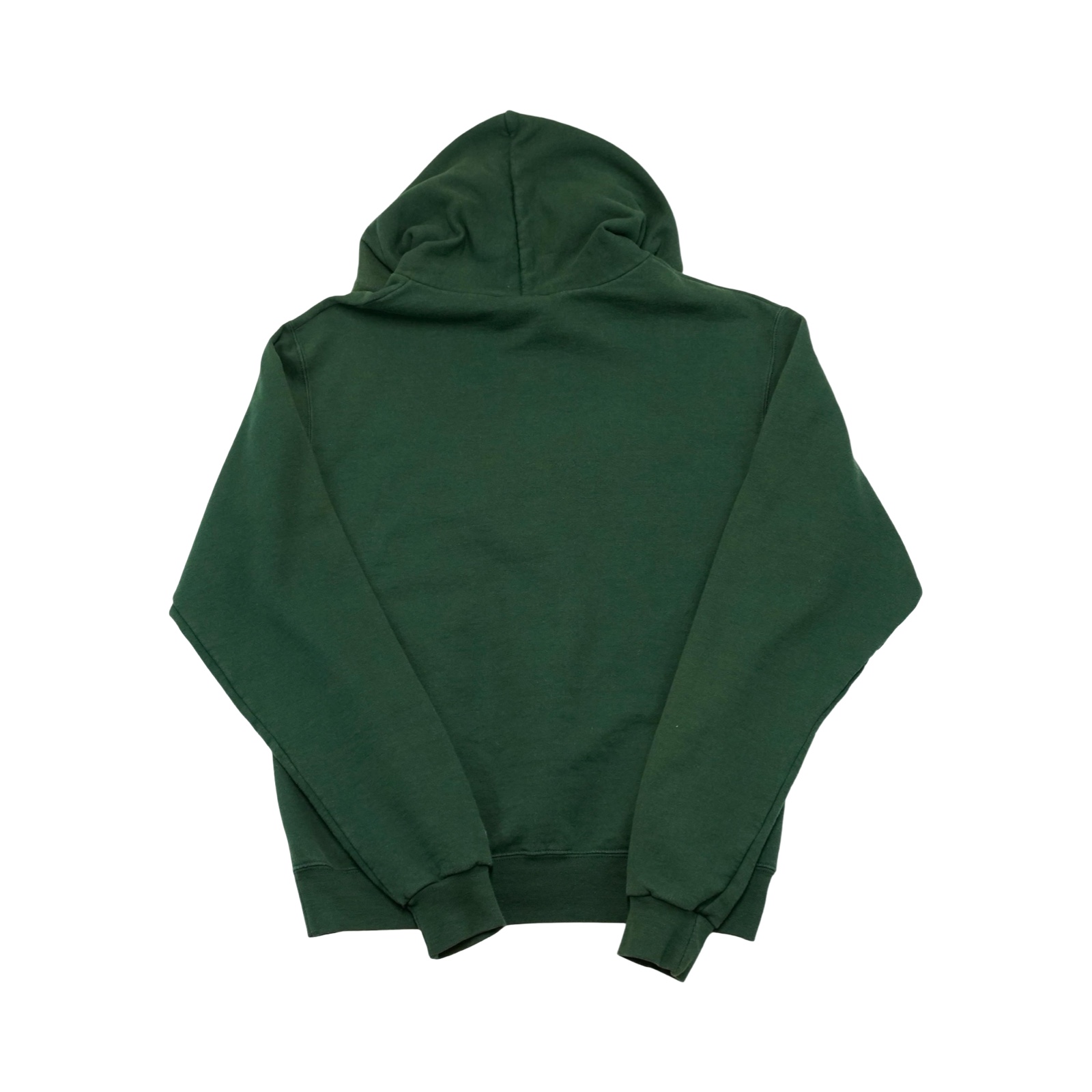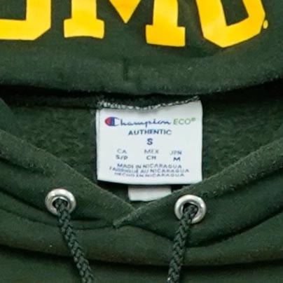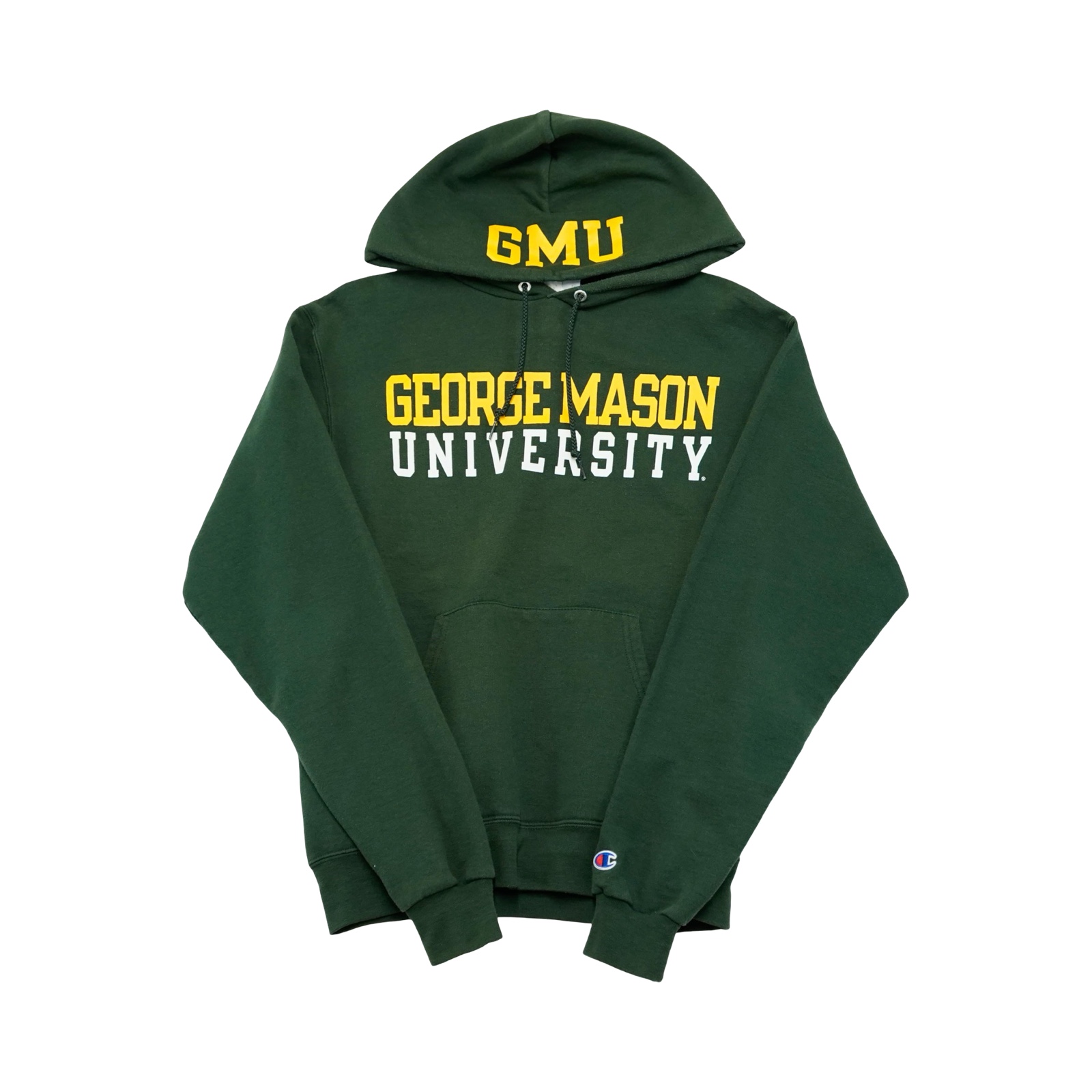 Pánská zelená mikina s kapucí značky Champion s potiskem George Mason University na přední straně a kapuci.