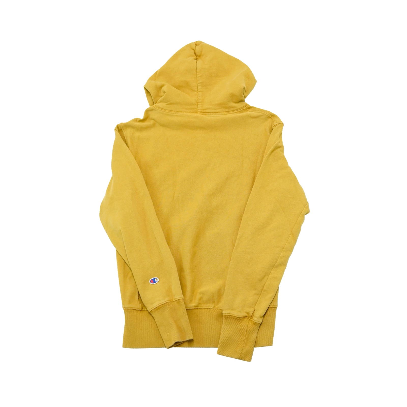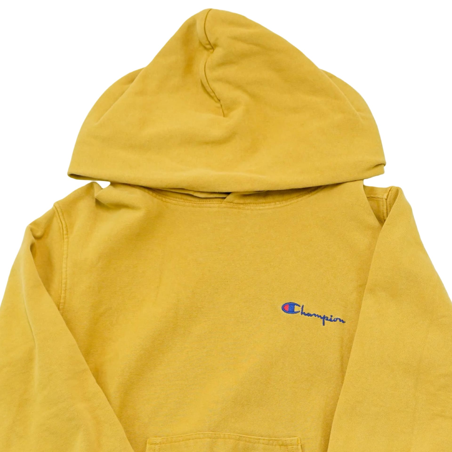 Pánská žlutá vintage mikina s kapucí značky Champion s malou nášivkou na přední straně.