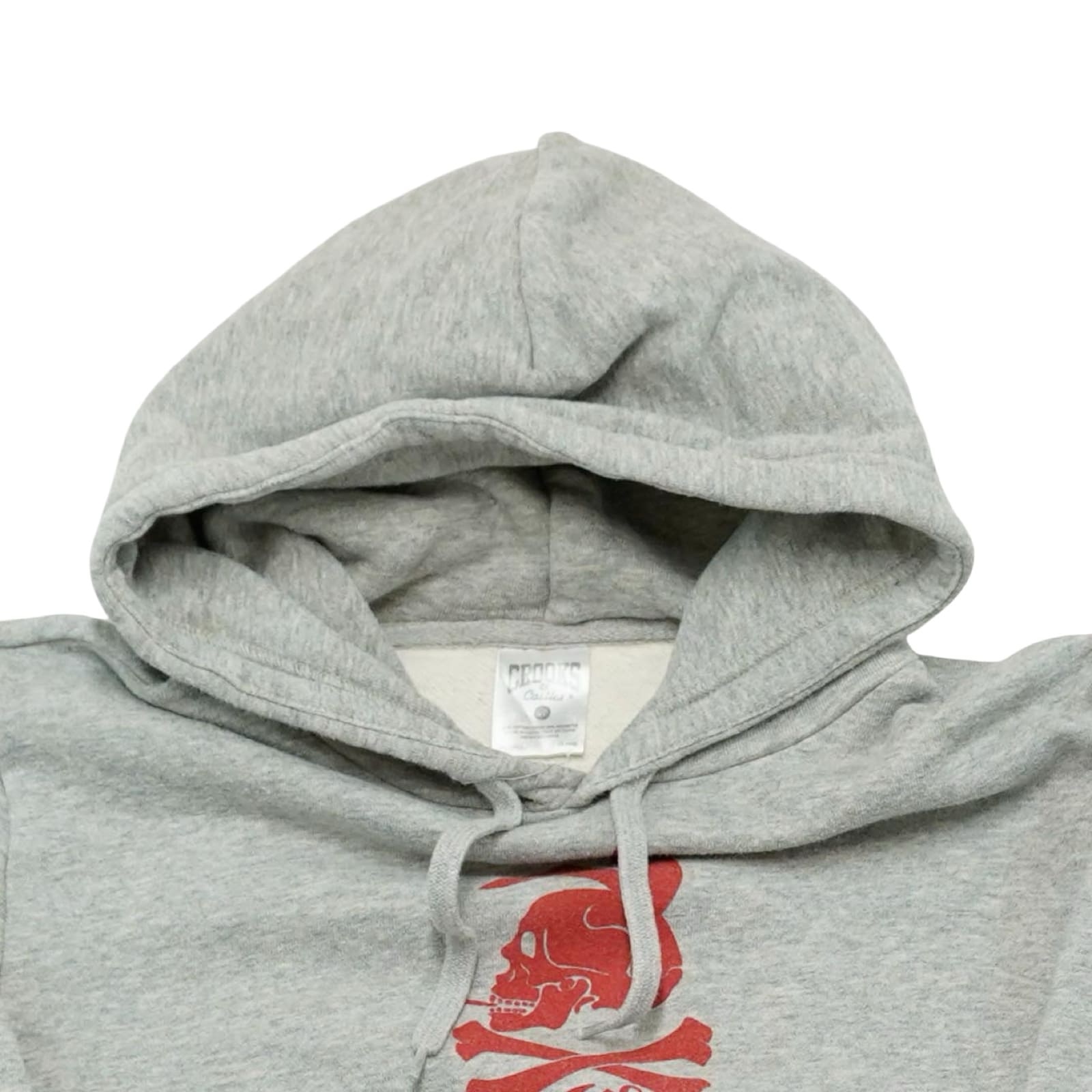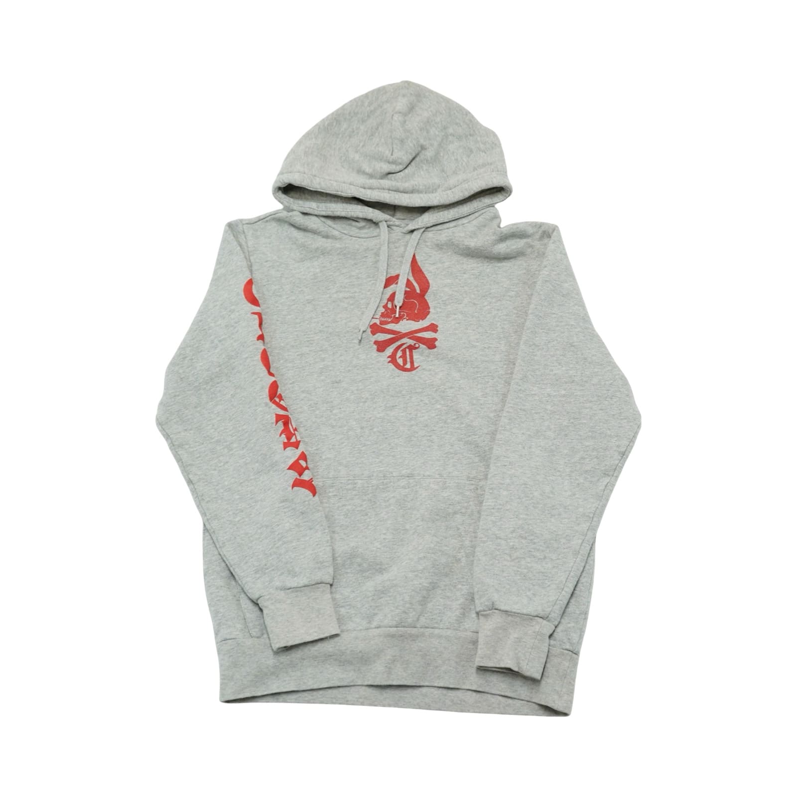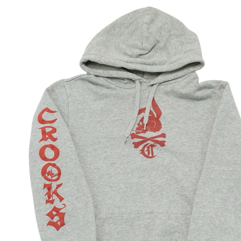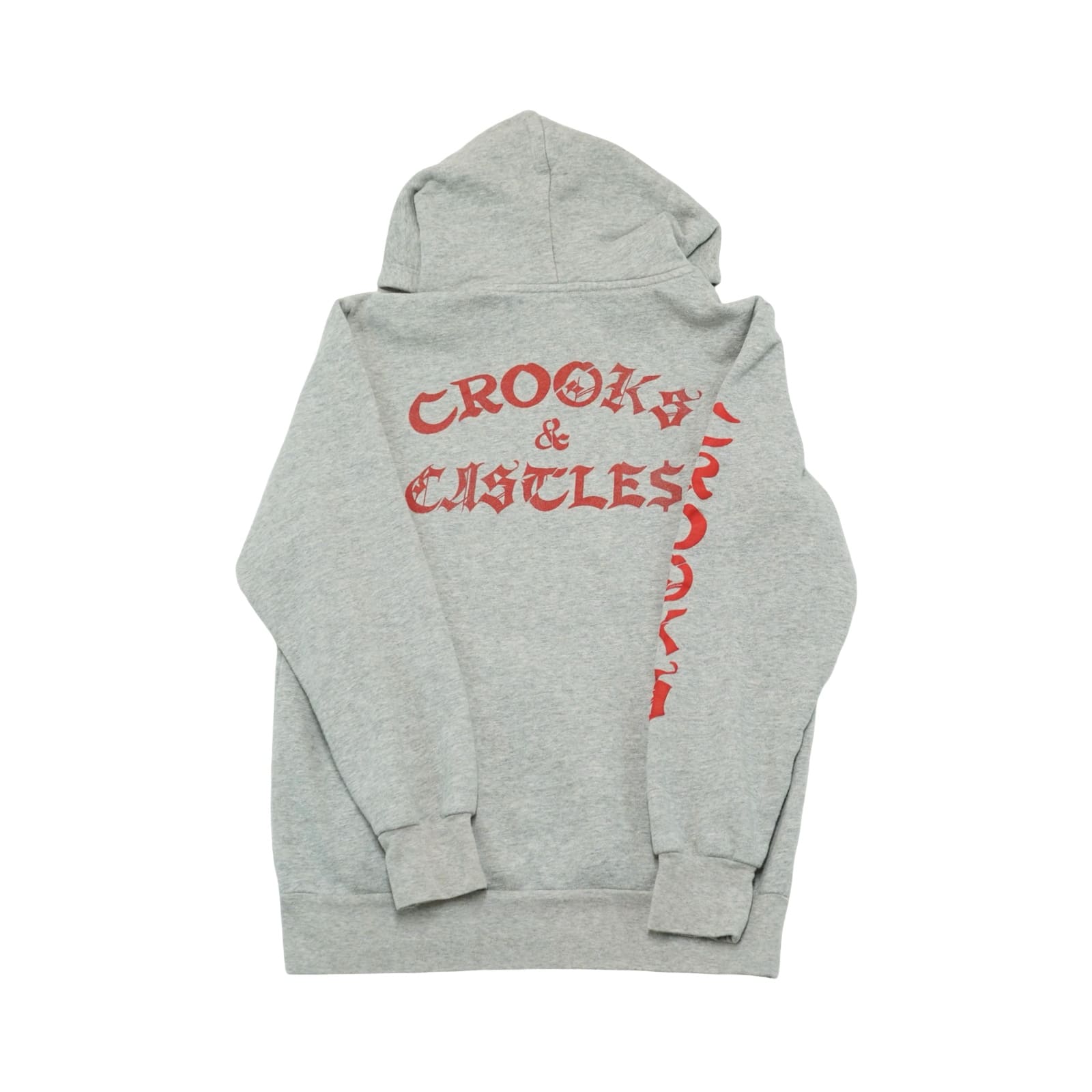Pánská šedá mikina s kapucí značky Crooks & Castles s červeným potiskem z obou stran a rukávu.