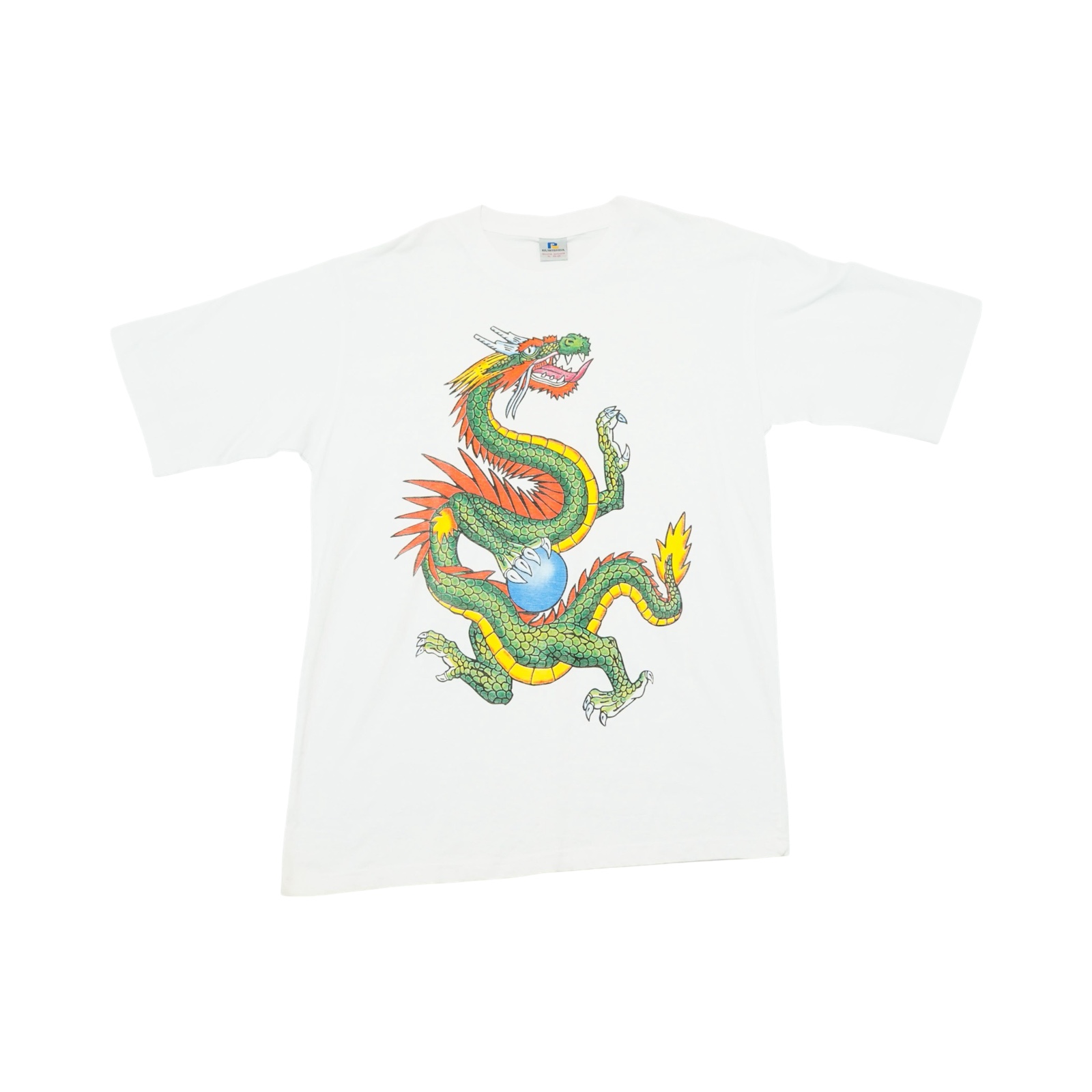 Pánské bílé vintage tričko s krátkým rukávem a potiskem Dragon na přední straně.