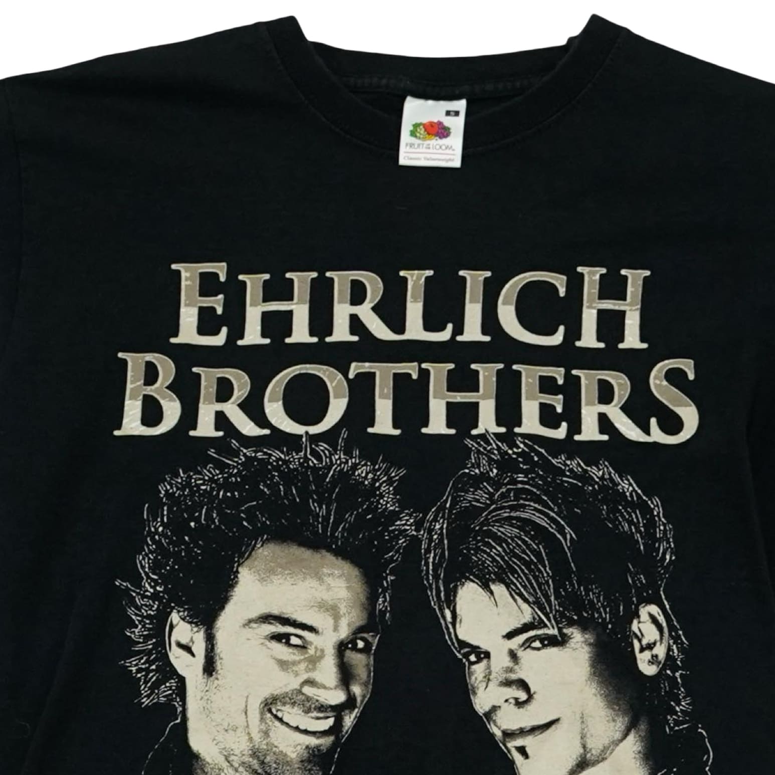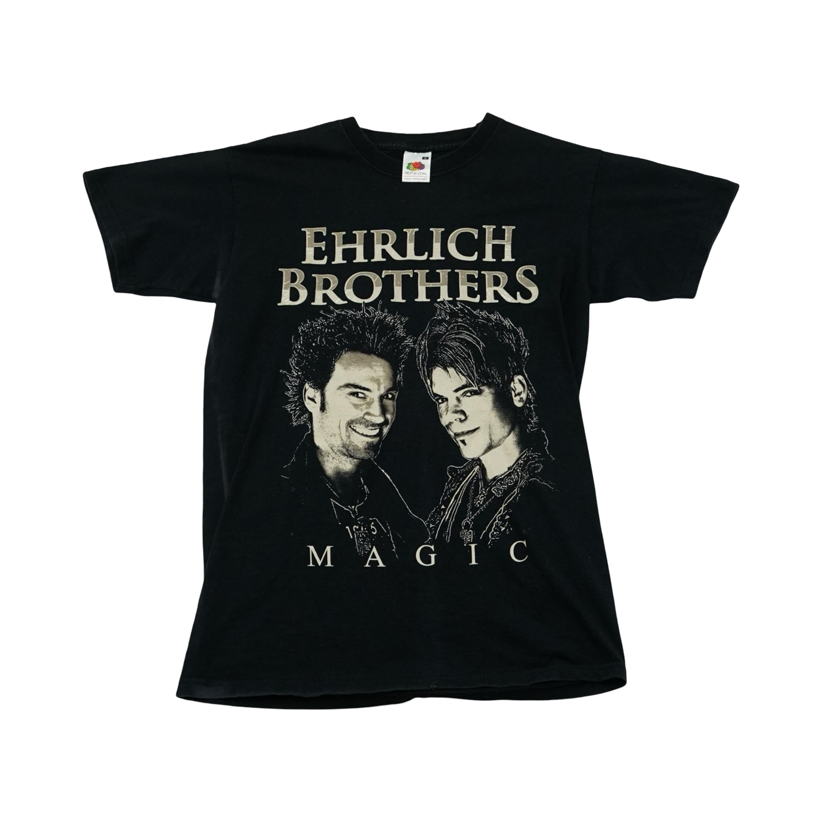 Pánské černé vintage tričko značky Fruit of the Loom s krátkým rukávem a potiskem Ehrlich Brothers z obou stran.