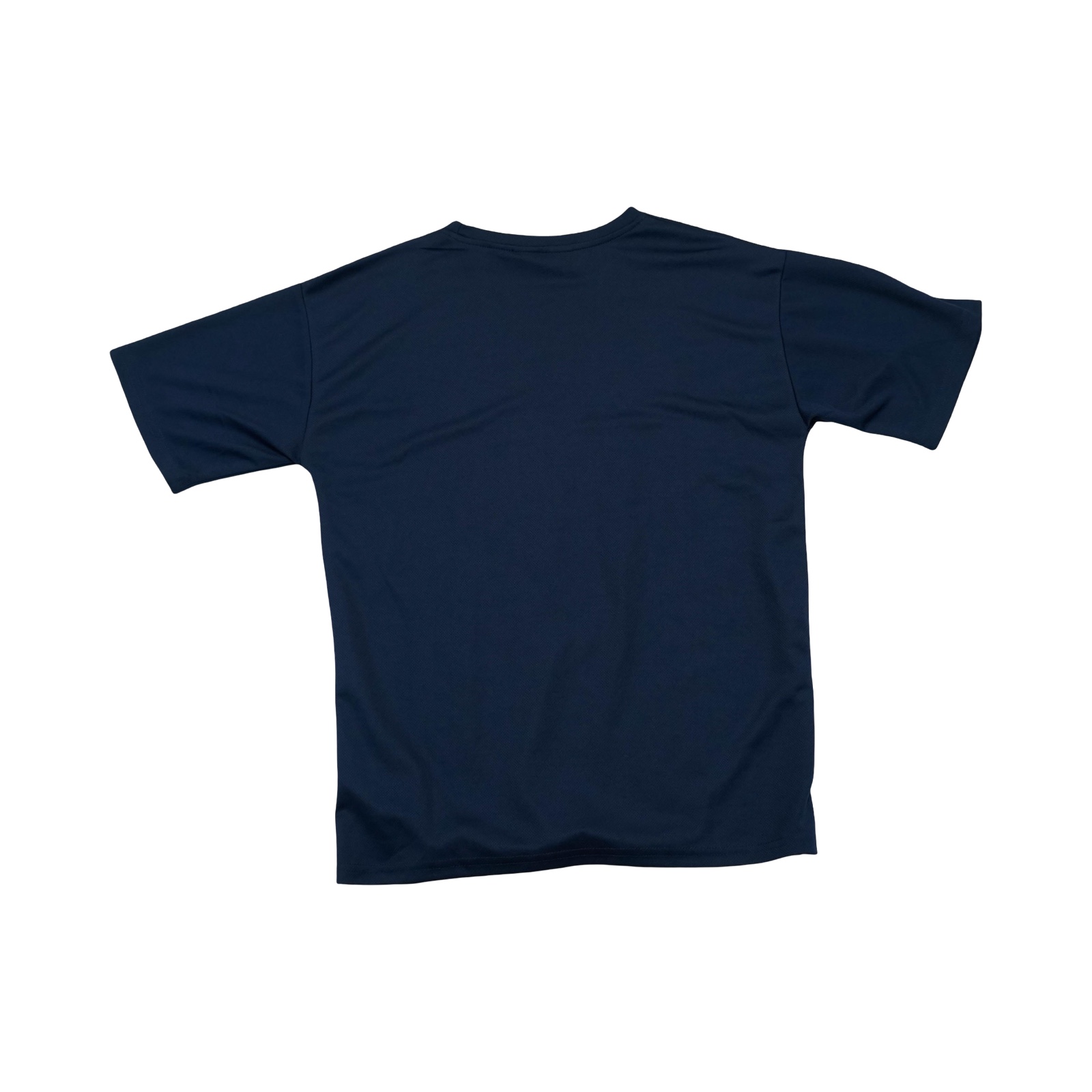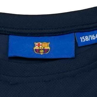 Pánský tmavě modrý fotbalový dres s krátkým rukávem a potiskem španělského fotbalového týmu FC Barcelona na přední straně.