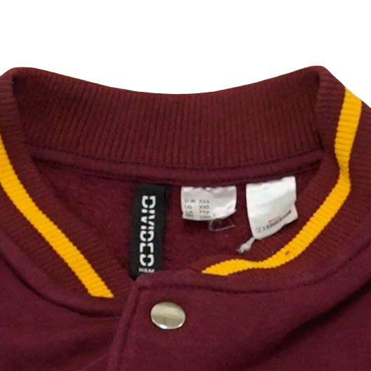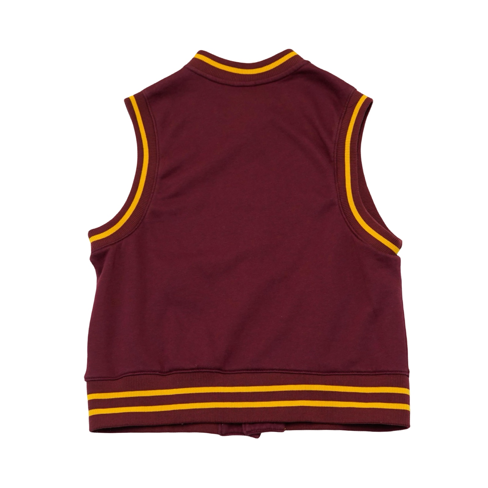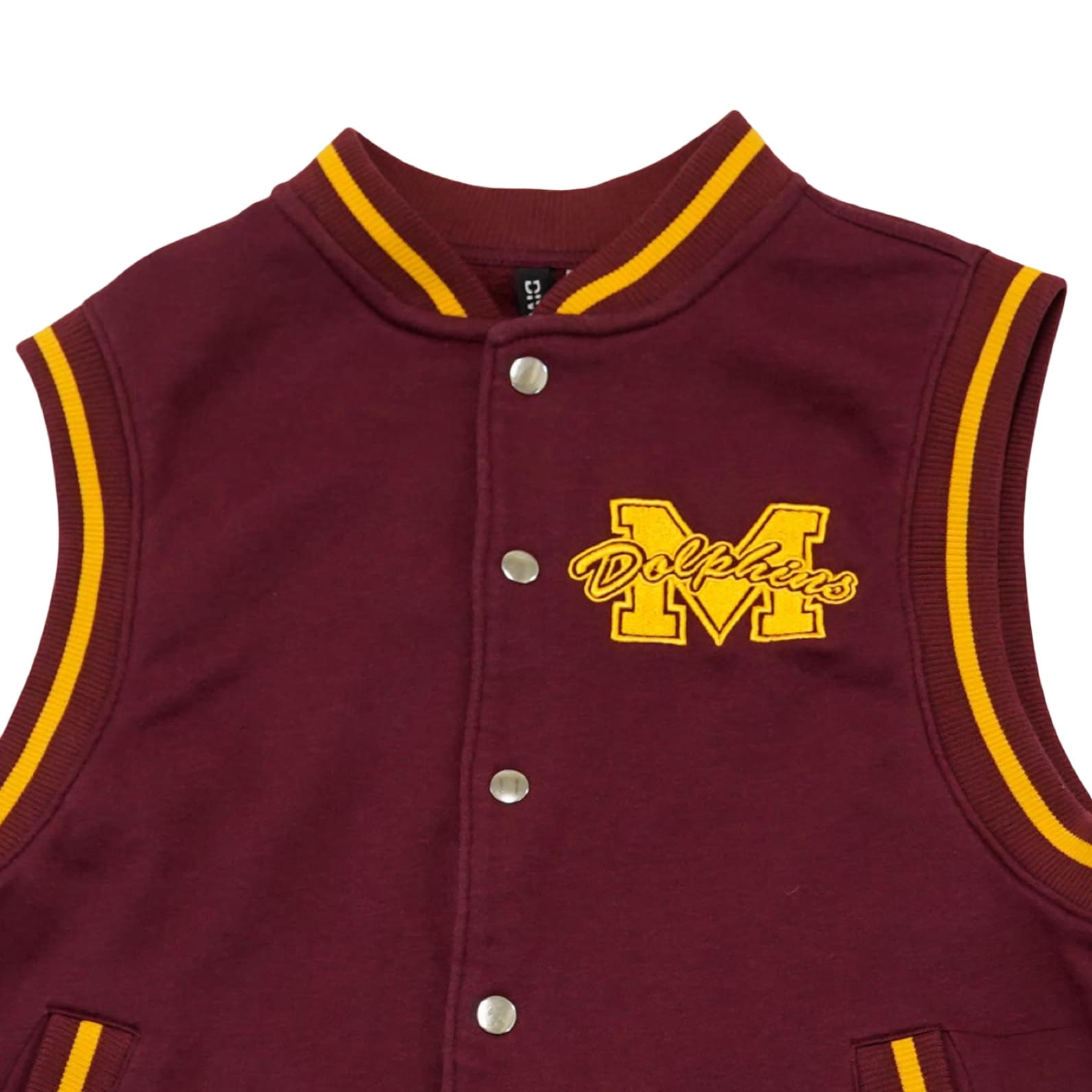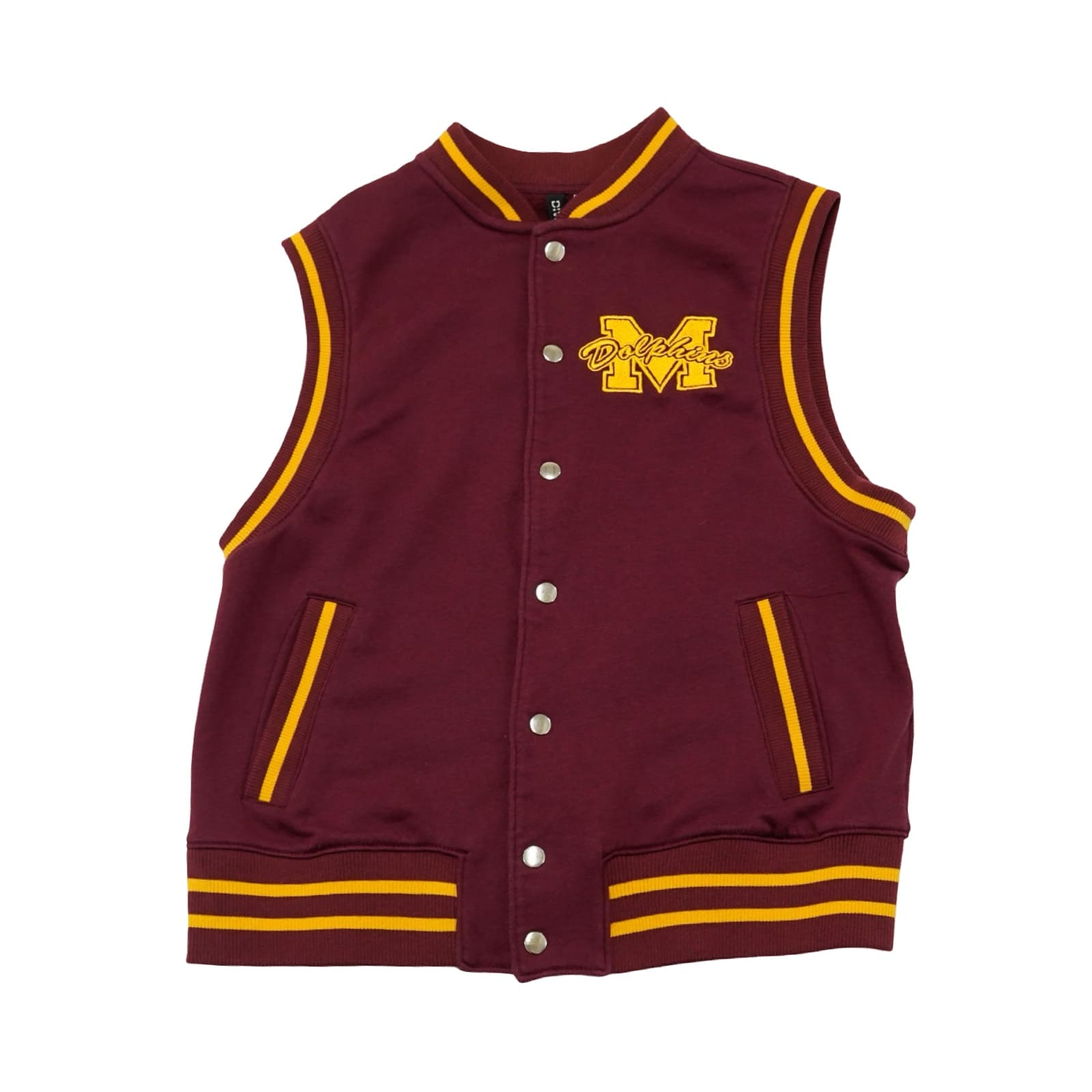 Pánská tmavě červená vesta značky H&M s nášivkou Dolphins Univerity na přední straně.
