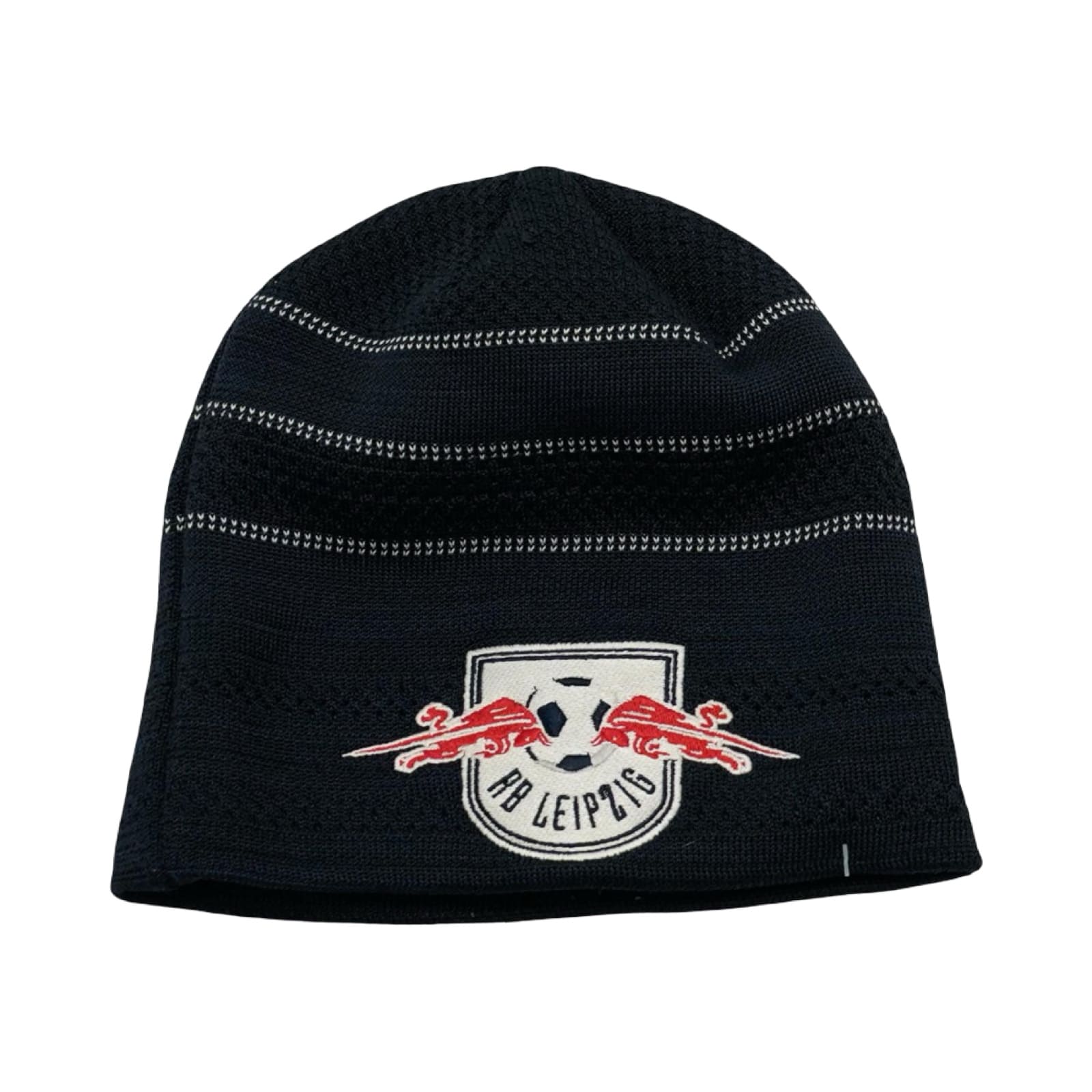 Unisex tmavě modrá zimní čepice značky New Era s nášivkou loga fotbalového týmu Red Bull Leipzig.