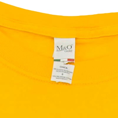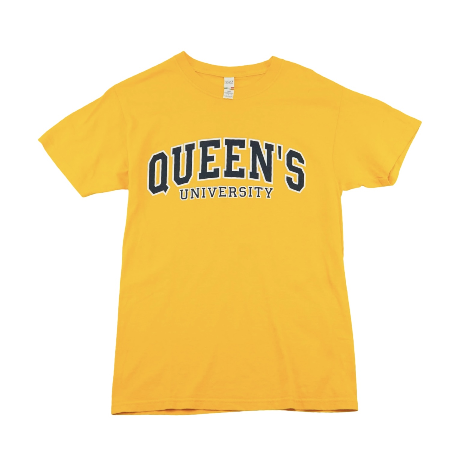 Pánské žluté tričko s krátkým rukávem a potiskem Queens University na přední straně.