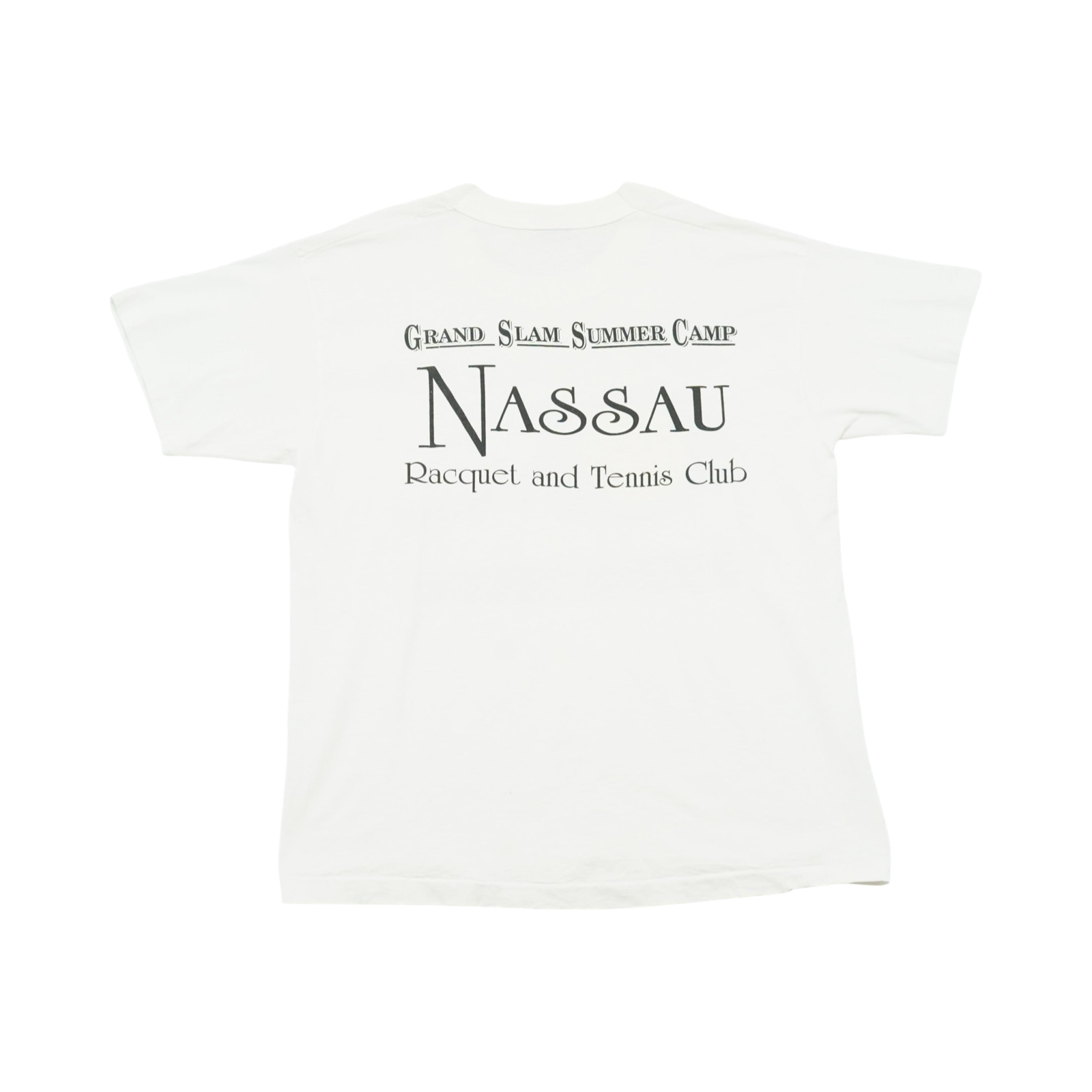 Pánské bílé tričko značky Screen Stars s krátkým rukávem a potiskem Nassau Tenis School na přední i zadní straně.